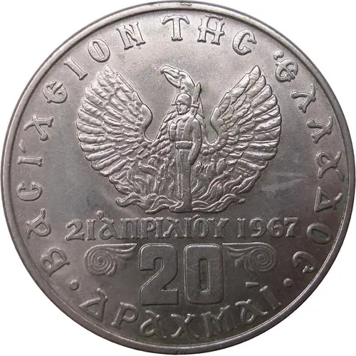 | Legenda do anverso | ΒaCΙλΕΙΟΝ ΤΗC ΕλλaΔΟC 21 aΠΡΙλΙΟΥ 1967 20 • ΔΡaΧΜaΙ • (Translation: KINGDOM OF GREECE 21 APRIL 1967 20 • DRACHMAI •) |
