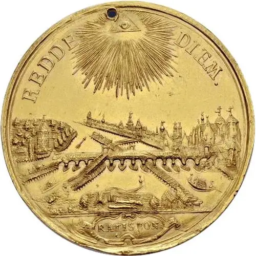 Описание аверса All-seeing eye over city view. City name in exergue within cartouche.