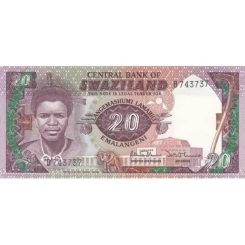 Obverse lettering CENTRAL BANK OF SWAZILAND THIS NOTE IS LEGAL TENDER FOR LANGEMASHUMI LAMABILI 20 EMALANGENI