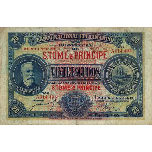 | 表面の銘文 | BANCO NACIONAL ULTRAMARINO DECRETO No. 17.154 PROVINCIA DE S. TOMÉ e PRÍNCIPE VINTE ESCUDOS PAGAVEL NAS DEPENDENCIAS DA PROVINCIA DE S. TOMÉ e PRÍNCIPE LISBOA, 26 de Junho de 1935. BRADBURY, WILKINSON & & Co. Ld. GRAVADORES, LONDRES (Translation: National Bank Overseas Decree no. 17,154 Province of St. Thomas and Prince Twenty Escudos Payable at the premises of the Province of St. Thomas and Prince Lisbon, June 26, 1935. Bradbury, Wilkinson & Co. Ltd. Engravers, London) |