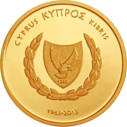 The original emblem of the Republic of Cyprus, which coincides with the emblem of the Central Bank of Cyprus, the words `ΚΥΠΡΟΣ`, `CYPRUS` and `KIBRIS` and the years `«1963 - 2013»`. |