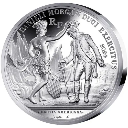 Victory of Daniel Morgan, about to be crowned by an Indian queen, allegory of America; female figure dressed in a short cuirass and wearing a feather headdress. The word `RF` and the date have been added to the obverse of this original medal. |