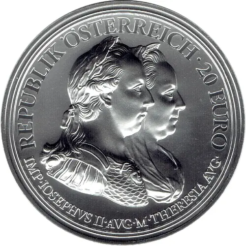 | Obverse lettering | REPUBLIK ÖSTERREICH · 20 EURO IMP·IOSEPHVS II·AVG·M·THERESIA AVG· (Translation: Republic of Austria) |