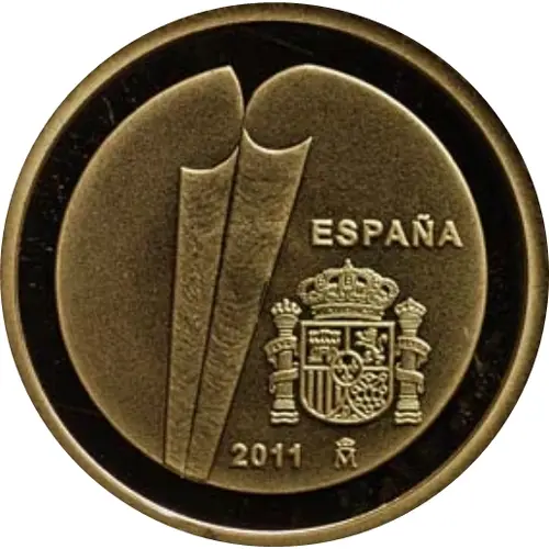 | Reverse description | The reverse reproduces the same symbolism of the two sheets of paper, on which appear spheres with stars that remind us of the European Union. |