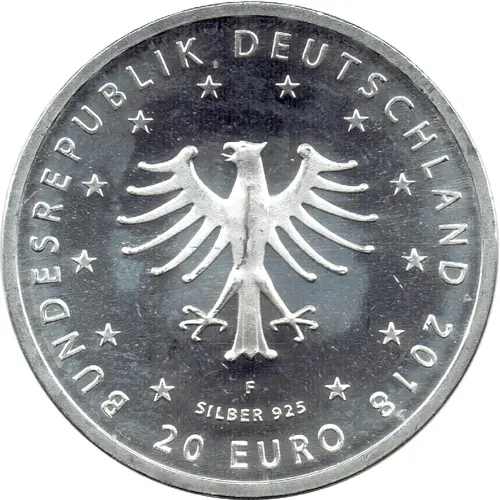 | Obverse lettering | BUNDESREPUBLIK DEUTSCHLAND F SILBER 925 2018 20 EURO (Translation: Federal Republic of Germany F Silver 925 2018) |
