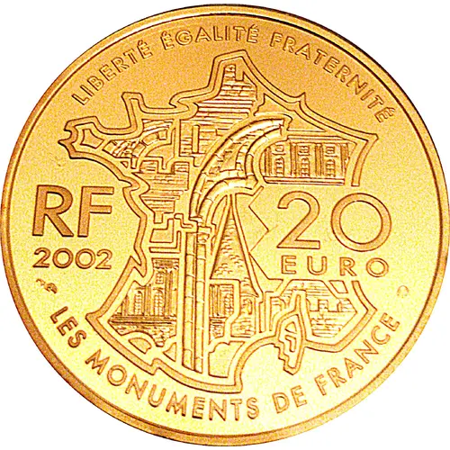 Map of France including various historical monuments with different types of architecture. The inscriptions are on both sides of the map. In clockwise order, at the top the motto `LIBERTÉ ÉGALITÉ FRATERNITÉ`, then `20 EURO`, at the bottom `LES MONUMENTS DE FRANCE`, the marks of the workshop, the year `2002` and finally `RF` of French Republic. |