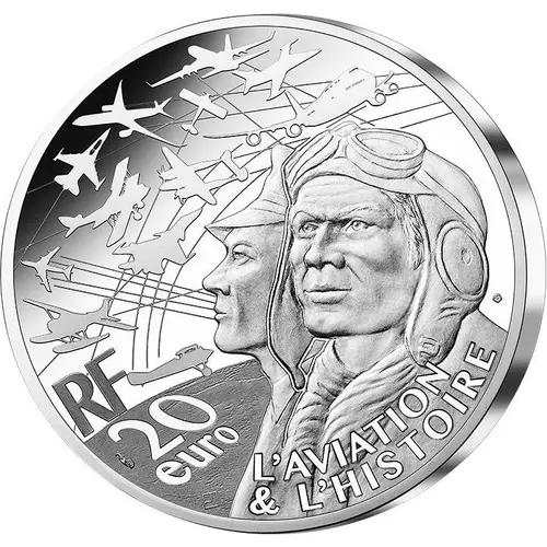 Two pilots` profiles symbolizing different eras and types of use - civil and military. Numerous planes are represented in the sky, also marking different eras and uses, a tribute to the history of the plane. The face value is written on the bottom left of the reverse side as well as the symbol `RF`. |