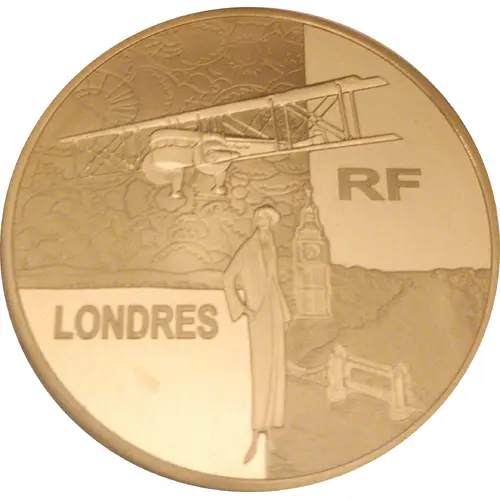 | Obverse description | Passenger bi-plane plane, taking off from London, Bigben and the tower Bridge are visible behind the woman. |