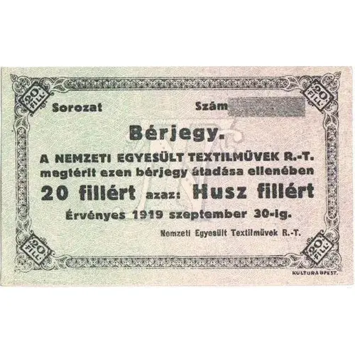 20 Fillér Nemzeti Egyesült Textilművek Rt., Budapest