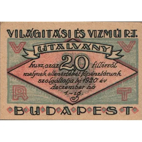 | Légende de l’avers | VILÁGÍTÁSI ÉS VÍZMŰ R.T. UTALVÁNY húsz, azaz 20 fillérről, melynek ellenértékét főpénztárunk szolgáltatja ki 1920. év deczember hó 1.-ig BUDAPEST (Translation: Lighting and Water Utilities Inc. Payment Order about 20 fillér, which will be payed in our main cash register till the 1st of December, 1920 BUDAPEST) |