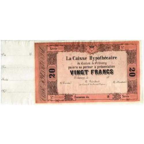 | Obverse lettering | La Caisse Hypothéquaire du Canton de Fribourg paiera au porteur à présentation DIX FRANCS 20 20 Fribourg, le 18 Le Caissier : Le Président du Conseil de Surveillance : Le Directeur : Emission du 18 |