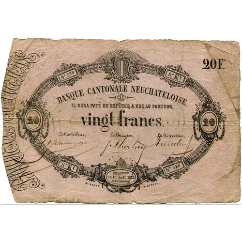 | Obverse lettering | 20 F.s BANQUE CANTONALE NEUCHATELOISE. IL SERA PAYÉ A VUE AU PORTEUR, vingt francs. 20 20 Le Contrôleur, Le Caissier, Le Directeur, ÉMISSION DU 1ER. AOÛT 1873 NEUCHÂTEL A. BOVET A GENEVE |
