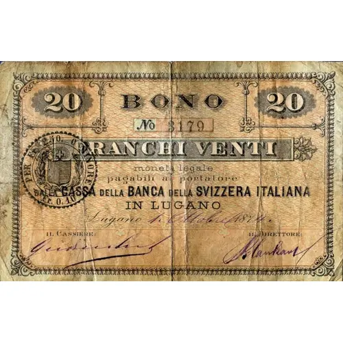 20 20 BONO FRANCHI VENTI moneta legale pagabili al portatore DALLA CASSA DELLA BANCA DELLA SVIZZERA ITALIANA IN LUGANO Lugano 1 Ottobre 1874 IL CASSIERE : IL DIRETTORE : |