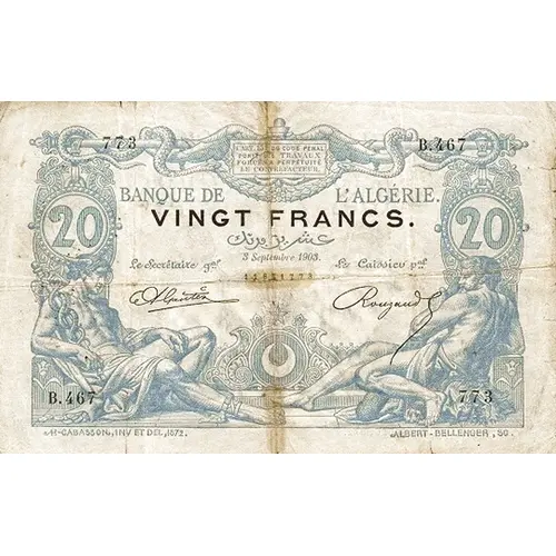 | Obverse lettering | Banque de l`Algérie Vingt Francs CH-CABASSON, INV ET DEL, 1872. ALBERT - BELLENGER SC. (Translation: Bank of Algeria Twenty Francs) |
