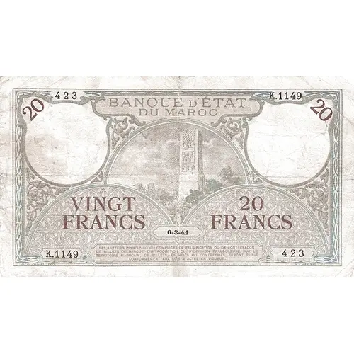Popis líce BANQUE D`ÉTAT DU MAROC TWENTY 20 FRANCS FRANCS