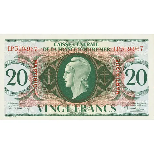 CAISSE CENTRALE LN924,602 - DE LA FRANCE D`OUTRE-MER - LN924,602 20 - MARTINIQUE - MARTINIQUE - 20 Le Diecteur Général - Le Président du Conseil de Surveillance VINGT FRANCS EDMUND DULAC DEL |