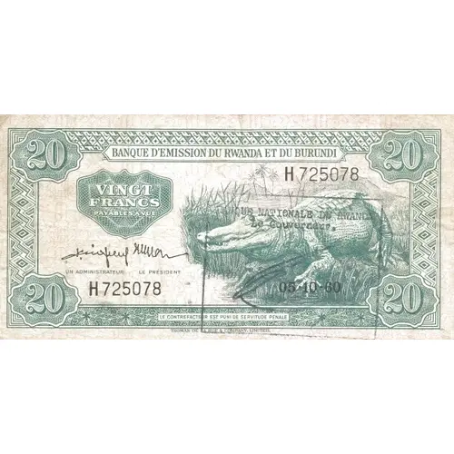 Obverse lettering BANQUE D`EMISSION DU RWANDA ET DU BURUNDI VINGT FRANCS PAYABLES A VUE LE CONTREFACTEUR EST PUNI DE SERVITUDE PENALE