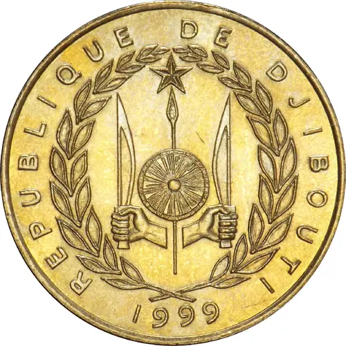 | Obverse description | A laurel wreath around the arms of Djibouti (two fists holding a knife, a round shield over a spear and a star on the top) and the date below |