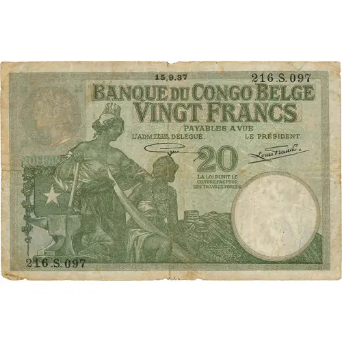 | Obverse lettering | BANQUE DU CONGO BELGE VINGT FRANCS PAYABLE A VUE |