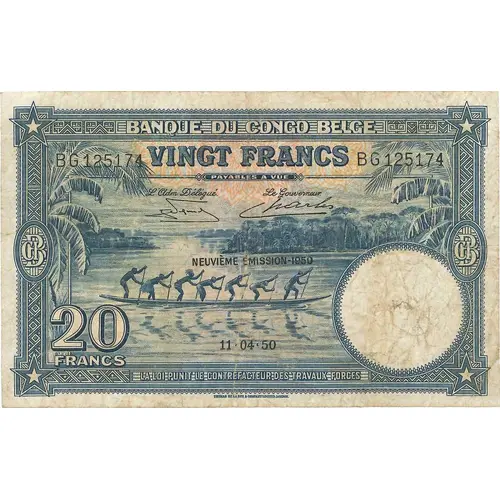 BANK VAN BELGISCH CONGO TWINTIG FRANK BETAALBAAR OP ZICHT De Afg Beheerder De Voorzitter NEGENDT UITGIFTE - 1950 20 FRANK DE NAMAKER WORDT DOOR DE WET MET DWANGABEID GESTRAFT THOMAS DE LA RUE & COMPANY LIMITED, LONDON (Translation: BANK OF BELGIAN CONGO TWENTY FRANK The Afg Administrator The President NINTH ISSUE 20 FRANK THE COUNTERFITTER IS PUNISHED WITH FORCED LABOUR THOMAS DE LA RUE & COMPANY LIMITED, LONDON) |