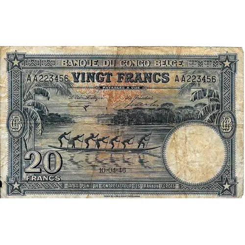 | Legenda do anverso | BANK VAN BELGISCH CONGO TWINTIG FRANK De Afg Beheerder De Voorzitter 20 FRANK DE NAMAKER WORDT DOOR DE WET MET DWANGABEID GESTRAFT THOMAS DE LA RUE & COMPANY LIMITED, LONDON (Translation: BANK OF BELGIAN CONGO TWENTY FRANK The Afg Administrator The President 20 FRANK THE COUNTERFITTER IS PUNISHED WITH FORCED LABOUR THOMAS DE LA RUE & COMPANY LIMITED, LONDON) |