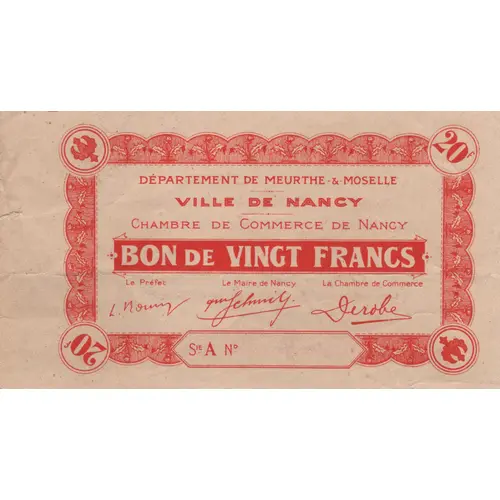 DEPARTEMENT DE MEURTHE & MOSELLE VILLE DE NANCY CHAMBRE DE COMMERCE DE NANCY BON DE VINGT FRANCS Le Préfet Le Maire de Nancy La Chambre de Commerce Sie A N° |