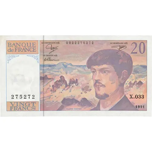 | Obverse lettering | Banque de France Vingt Francs Claude Debussy 20 (Translation: Bank of France Twenty Francs Claude Debussy 20) |