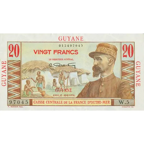 | Obverse lettering | GUYANE 20 VINGT FRANCS LE DIRECTEUR GÉNÉRAL, GUYANE EMILE.GENTIL CAISSE CENTRALE DE LA FRANCE D`OUTRE-MER P. MUNIER FEC. BROUTIN SC. (Translation: Guiana Twenty Francs Emile.Gentil Central Fund of Overseas France) |