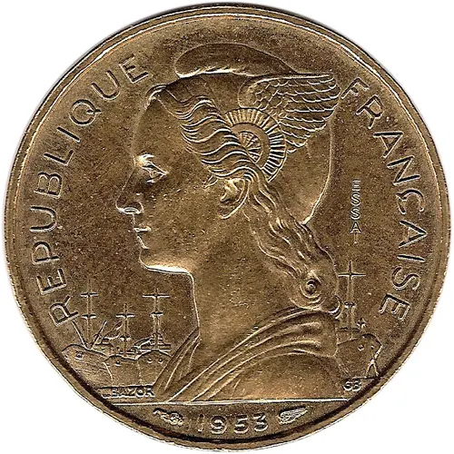 Artistry: While the specific engraver for this Essai is not explicitly documented, the design adheres to the prevailing academic and neoclassical stylistic conventions of the Monnaie de Paris, which produced coinage for French territories. The obverse typically features a dignified effigy of Marianne, the allegorical personification of the French Republic, often depicted in profile wearing a Phrygian cap. This representation embodies republican ideals of liberty and reason. The reverse would feature the denomination "20 FRANCS" and the issuer "MADAGASCAR," often encircled by a wreath or other traditional numismatic motifs, with the year 1953 prominently displayed, along with the crucial "ESSAI" mark indicating its trial status.