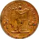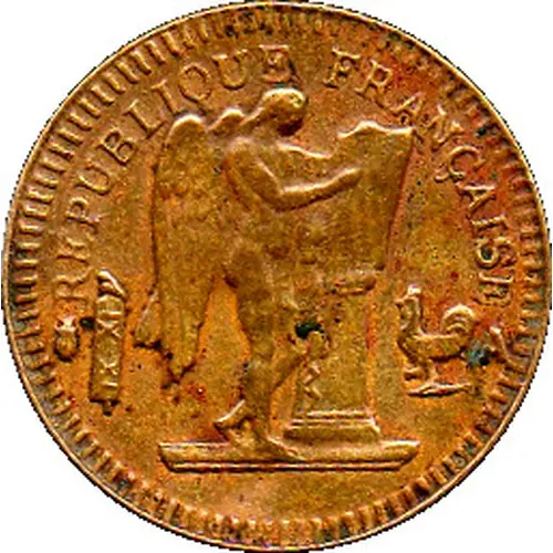 Genius of the Republic standing on the right, engraving the tables of the Constitution placed on a cippe, flanked by a lictor beam on the left and a rooster on the right |