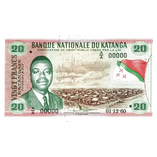 | Obverse lettering | BANQUE NATIONALE DU KATANGA ASSOCIATION DE DROIT PUBLIC CREEE PAR LA LOI VINGT FRANCS KATANGAIS PAYABLES A VUE |