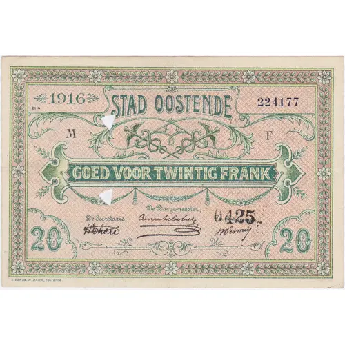 1916 STAD OOSTENDE 20 20 GOED VOOR TWINTIG FRANK 20 UITBETAALBAAR IN DE GEMEENTEKAS TEN LAATSTE DRIE MAANDEN NA DE VREDESLUITING (Translation: Ville d`Ostende. Bon pour vingt francs. Échangeable auprès de la Caisse communale au plus tard trois mois après la signature de la paix.) |