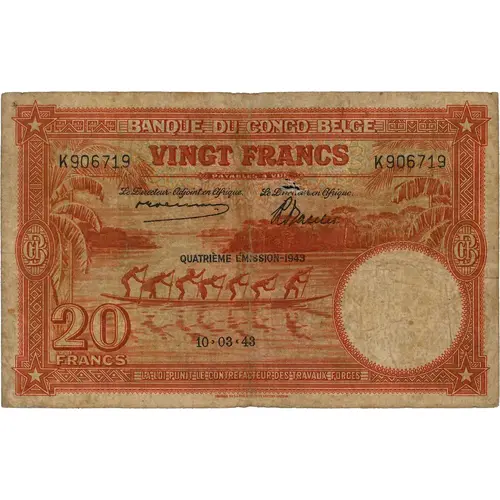 BANK VAN BELGISCH CONGO TWINTIG FRANK BETAALBAAR OP ZICHT VIERDE UITGIFTE -1943 DE NAMAKER WORDT DOOR DE WET MET DWANGARBEID GESTRAFT |