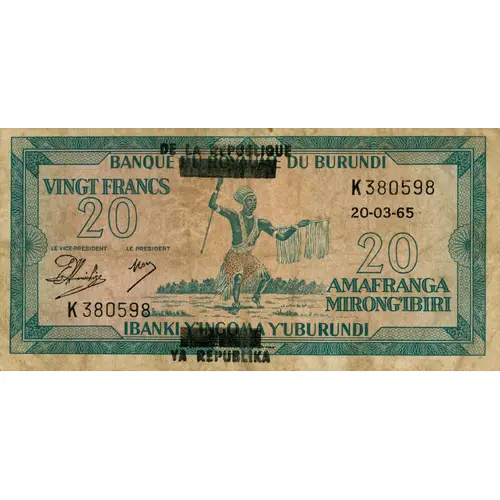 BANQUE DE LA REPUBLIQUE DU BURUNDI VINGT FRANCS AMAFRANGA MIRONG`IBIRI IBANKI YA REPUBLIKA Y`UBURUNDI LE VICE-PRESIDENT LE PRESIDENT 20-03-65 20 (Translation: Bank of the Republic of Burundi. Tenty francs. The vice president, the president.) |