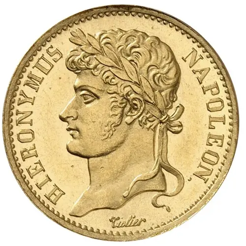 | Opis rubu | KOENIG. V. WESTPH. FR. PR. 20 FRANK. 1808 J |
