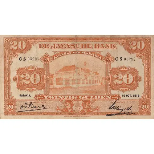 | Obverse lettering | DE JAVASCHE BANK BETAALD AAN TOONDER 20 TWINTIG GULDEN BATAVIA, 16 OCT. 1919 JB AMERICAN BANK NOTE COMPANY. (Translation: The Javasche Bank Pay to the Bearer Twenty Gulden Batavia, October 16, 1919 American Bank Note Company.) |