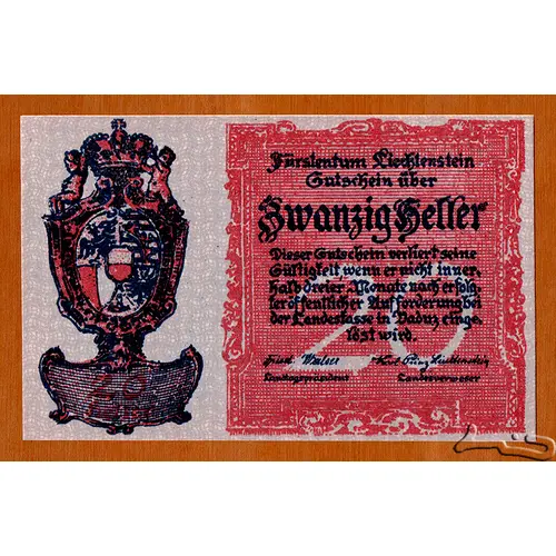 Obverse lettering Fürstenstum Liechtenstein Gutschein über Zwanzig heller Dieser Gutschein verliert seine Gültigkeit wenn er nicht inner, halb dreier Monate nach ersolg- seröffentlicher Nufforderungbei der Landeskasse in Vaduz einge- föst wird