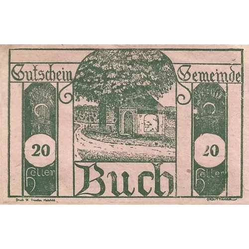 (Translation: Gutschein Gemeinde Buch 20 heller 20 heller) |