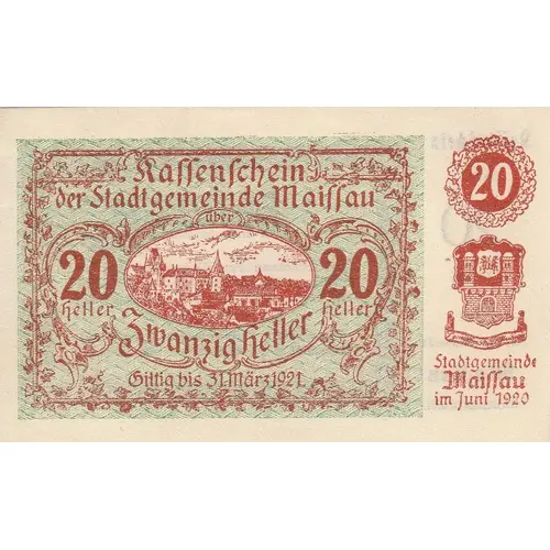 Obverse lettering Kassenschein der Gemeinde Maissau 20 heller zwanzig heller Gültig bis 31 März 1921