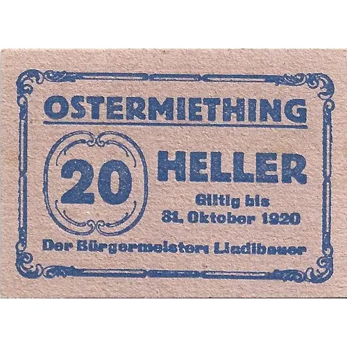 Obverse lettering Ostermiething 20 Heller Gültig bis 31. Oktober 1920 Der Burgermeister: Lludlbauer
