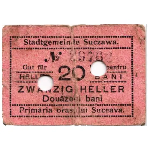 | Ön yüz lejandı | Stadtgemeinde Suczawa. Gut für HELLER 20 Bun pentru BANI ZWANZIG HELLER Douăzeci bani Primăria orașului Suceava. |