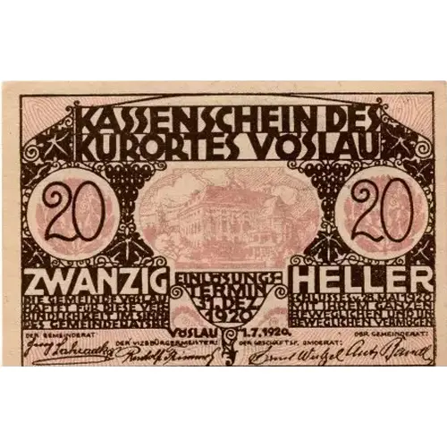 | Obverse lettering | Kassenschein des Kurortes Voslau 20 Heller |