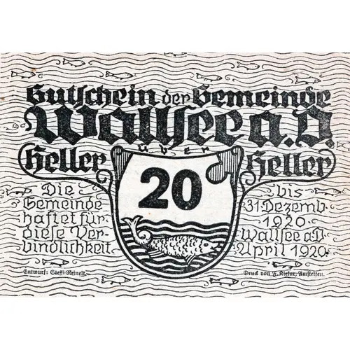 | Obverse lettering | Gutschein der Gemeinde Wallsee a.D. über Die Gemeinde haftet für diele Vervindlichkeit bis 31 Dezemb 1920. Walsee a.D. April 1920. Entwurt: Gtefft Renelz Deud von F. Aietor, Amftetten |