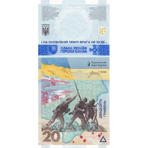 | Obverse description | The main image of the front of the note are three Ukrainian soldiers who are hoisting a Ukrainian state flag (photo entitled “Ukrainian soldiers are hoisting a flag” by Oleksandr Smirnov) against the backdrop of fragments of a map of Ukraine and the flags of the countries that support Ukraine - namely the United Kingdom, the European Union, the United States of America, and Canada. |