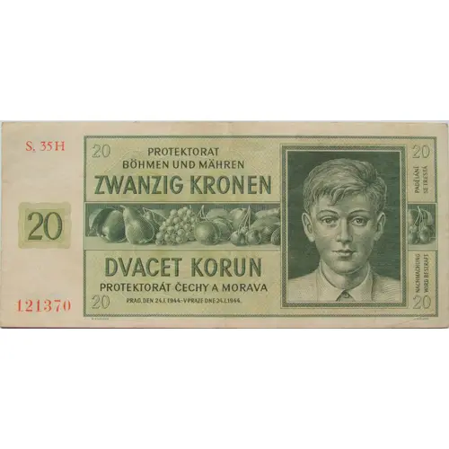 | Obverse lettering | 20. Protektorat Böhmen und Mähren. Zwanzig Kronen. Dvacet Korun. Protektorát Čechy a Morava. Prag. Den 24.1.1944 - V Praze dne 24.1.1944 B.FOJTASEK J. SCHMIDT |