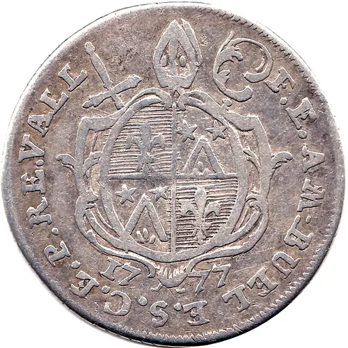 Historical Context: The 1777 20 Kreuzers coin was issued by Franz Friedrich Ambüel, Prince-Bishop of Sion (Sitten), who reigned from 1760 to 1780. During this late 18th-century period, Sion remained an ecclesiastical principality within the Holy Roman Empire, exercising significant temporal and spiritual authority over the Valais region. This coinage served as a tangible expression of the Prince-Bishop’s sovereign right to mint currency, a crucial symbol of independence amidst the complex political landscape of pre-revolutionary Europe. The 20 Kreuzers denomination was a standard silver unit, facilitating local commerce and integration into broader Imperial monetary systems.