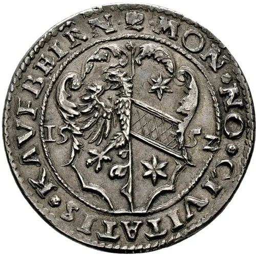 Technical/Grading: Struck in silver at 8.66 grams and 30 millimeters, the 1552 Zwanziger would have been produced using traditional hammer striking methods. For grading, key high-points to examine include the details of the city gate or tower, particularly its architectural elements and any surrounding legends, as well as the intricate feathers and regalia of the Imperial Eagle. A superior example would exhibit a well-centered strike with full details on both obverse and reverse, minimal planchet flaws, and a strong impression, contrasting with common weak strikes inherent to the period's minting technology.