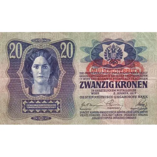 | Obverse description | Woman, Austrian arms . German text. Overprint `DEUTSCHÖSTERREICH` on AUSTRIA P#13. |