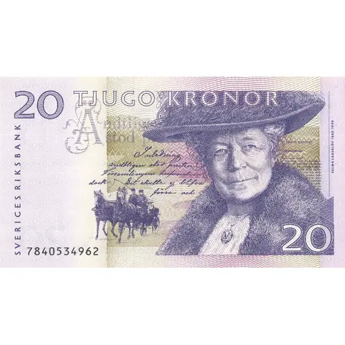 | Chữ khắc mặt trước | TJUGO KRONOR SVERIGES RIKSBANK (Translation: Twenty Kronor National Bank of Sweden) |