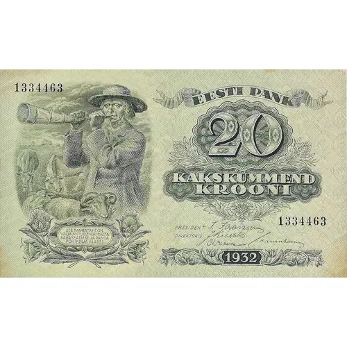 EESTI PANK 20 KAKSKUMMEND KROONI 1932 SEE PÄNGATÄHT ON VÄLJA ANTUD 3 MAI 1927 A. RAHASEADUSE JA PANGA PÕHIKIRJA ALUSEL (Translation: Bank of Estonia Twenty Krooni This banknote was issued under the Money Act of May 3rd 1927 and the bank`s statutes.) |